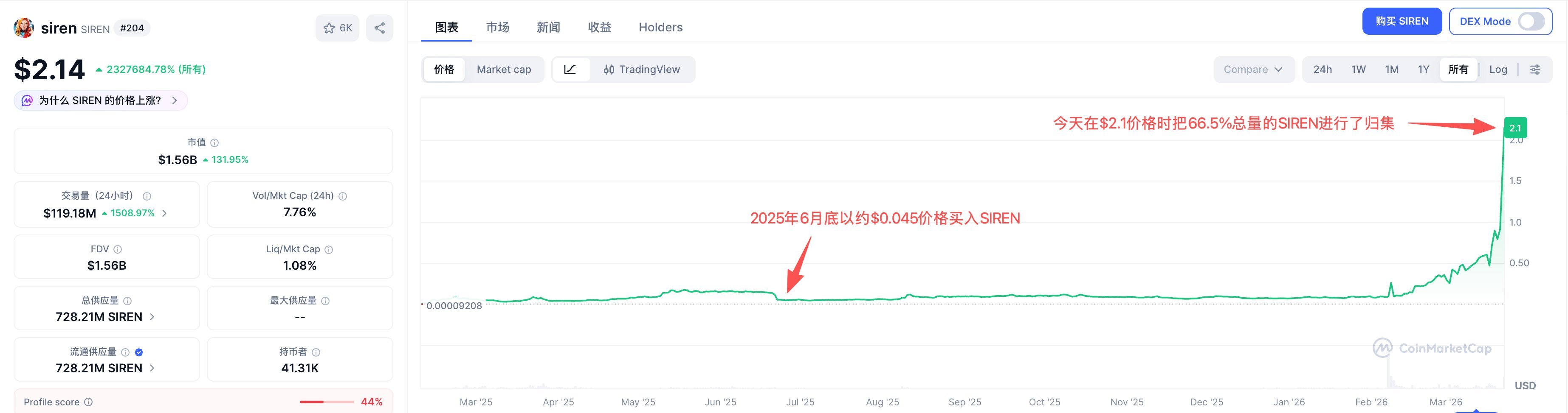 链上数据显示,上述筹码于 2025 年 6 月底通过数百个钱包以约 0.045 美元的均价建仓,合计耗资约 2180 万美元。SIREN 过去约一个半月内从 0.08 美元上涨至 2.1 美元,涨幅约 26 倍;上述持仓浮盈约 47 倍。