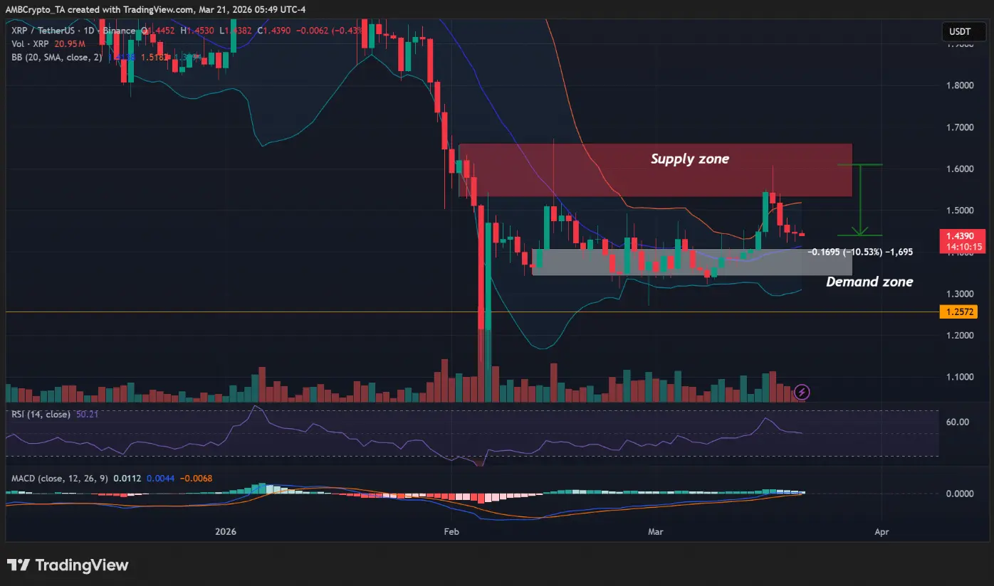 On the price chart, XRP was recently rejected at the $1.6 level — a key resistance zone that previously halted the breakout in February. Meanwhile, buying interest continues to leverage the $1.34 area as a potential entry point, indicating demand still exists at lower price levels.